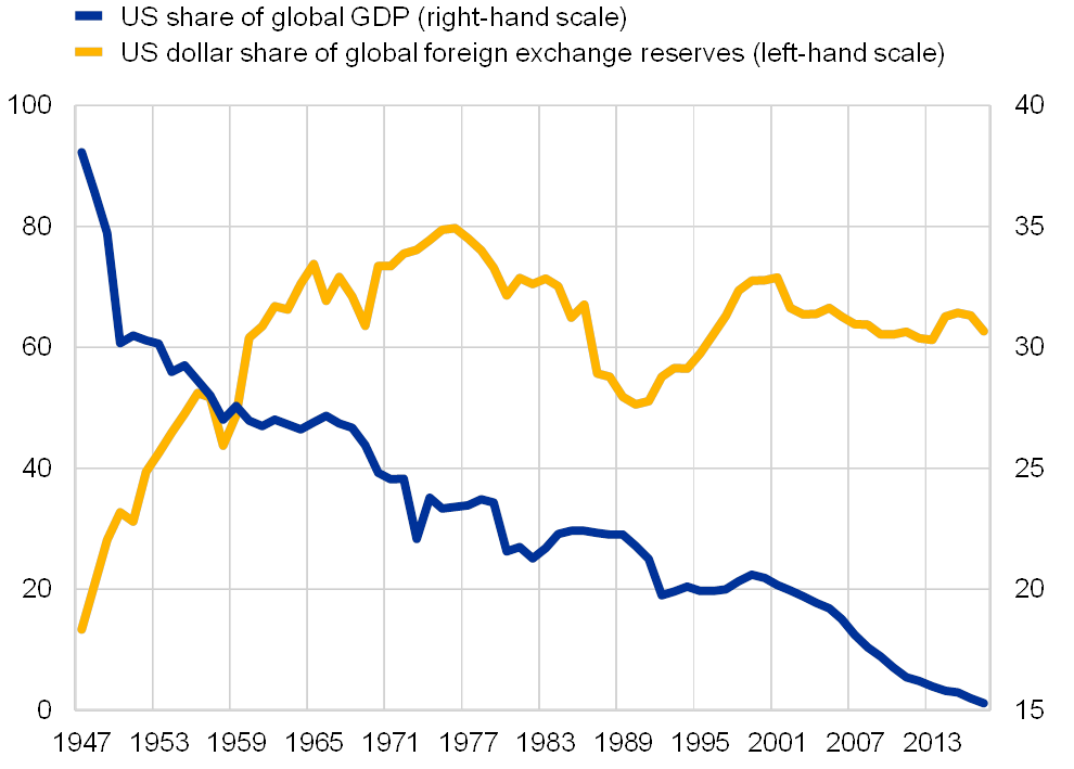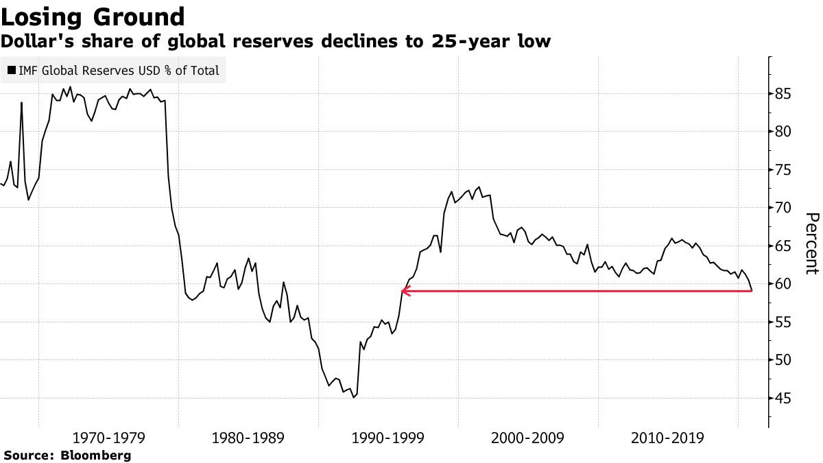 Takže je zásadní rozdíl mezi faktem, zda někdo provádí nominální účtování v dolarech, a přitom už dávno obchoduje jiným způsobem. Nebo si naopak dolar kupuje od USA jako platidlo nebo jako rezervní měnu, například v dluhopisech FEDu. Následující přehledný graf ukazuje podíl dolaru jako rezervní měny ve světě.