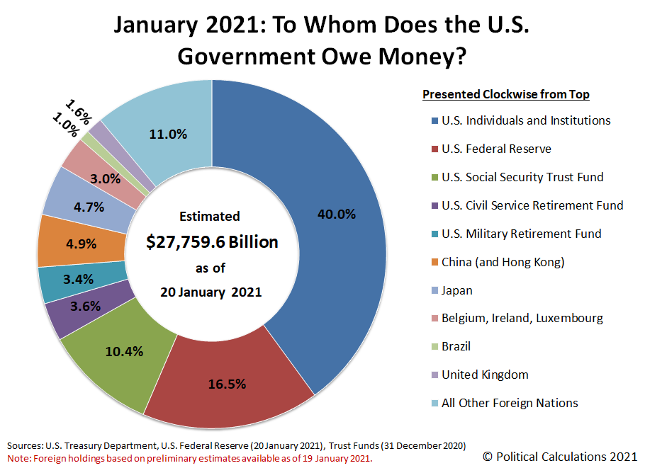 USA se tou vratkou dluhového dolaru jednoduše zadusí, protože dluhopisy patří především americkým institucím. USA jsou nejvíce absolutně zadluženým státem světa, protože mají manko 20 bilionů dolarů, což je přibližně 106 % jejich ročního HDP. A jak z grafu sami vidíte, jsou sami sobě hlavním dlužníkem. To je jak nějaká von der Leyenová, která za moje daně nakoupila 10 dávek Pfizeru na opíchání každého občana EU. Podle probíhajícího ne/vyšetřování přitom nekradla ani ona, ani její manžel. Ale poslancům z EP smlouvy s Pfizerem ukázat nechce, a korespondenci s Pfizerem z jejího úředního mailu, tu také nechce vydat. Jak běží opíchávání dluhovým dolarem?