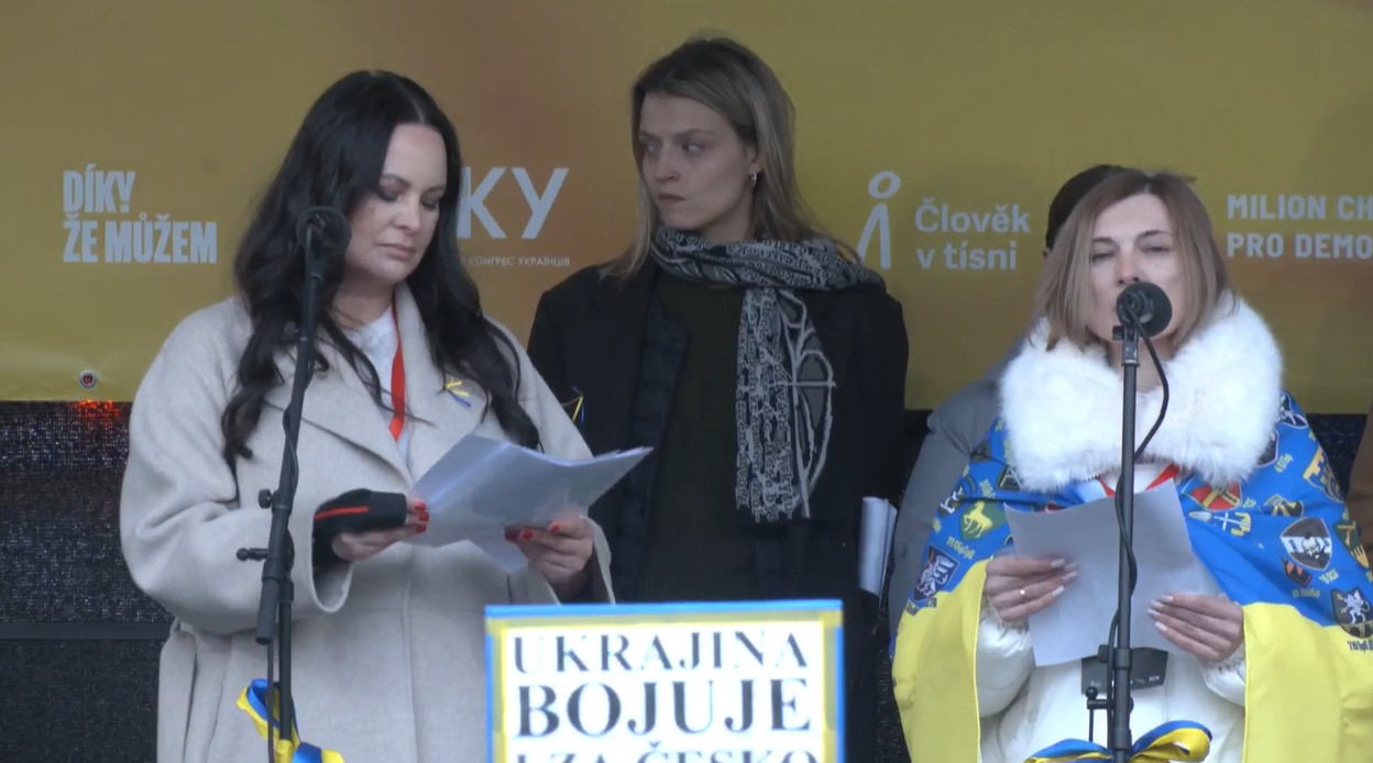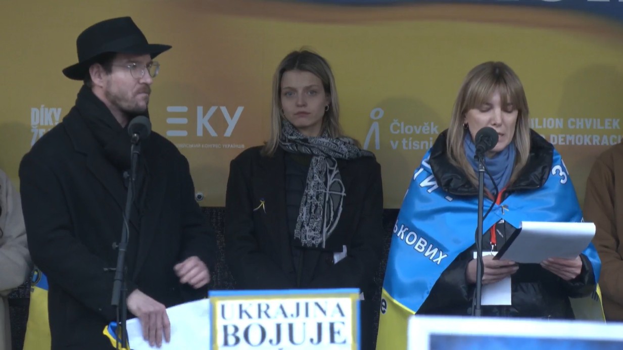 Herečka Jitka Čvančarová přečetla překlad vystoupení další ukrajinské mluvčí. „Jsem manželkou pohřešovaného vojáka. Tisíce vojáků se pohřešují, tisíce jsou v zajetí ve strašných podmínkách. Civilisté se stávají rukojmími války. Nevím, zda jsou naši blízcí naživu, zda potřebují naši pomoc. Víme, že mlčení a nečinnost zabíjejí podruhé. Tohle všechno je známkou genocidy ukrajinského národa. Prosíme svět, aby nebyl lhostejný. Dokud nenajdeme pravdu, válka bude trvat v našich srdcích. Prosíme vás, abyste jednali. Svoboda a životy našich blízkých závisí na solidaritě civilizovaného světa,“ naléhala mladá žena.