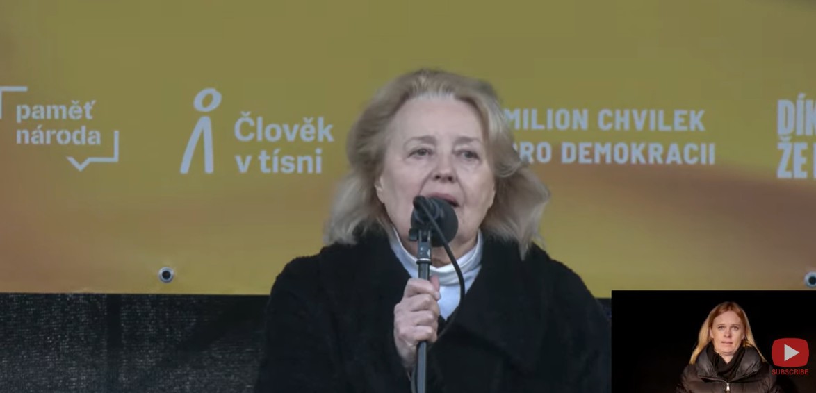 Nechyběla ani Slovenka Magda Vašáryová. „Je to osm roků, co zabili Jána Kuciaka a jeho snoubenku,“ připomněla na Staroměstském náměstí a dodala, že je třeba pohnat před soud člověka, který k tomu dal příkaz.
