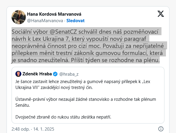 Senátorka Hana Kordová Marvanová to napsala „natvrdo“:
