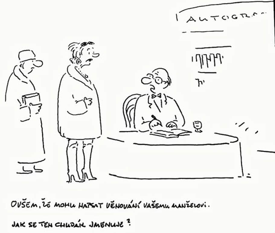 Co si tvoje žena přeje pod stromeček?“ vyzvídá Bohouš na Kájovi. „Briliantový náhrdelník.“ – „Briliantový náhrdelník?! Není nějak moc náročná?“ – „Proč by byla náročná? Já zase od ní chci sportovního Jaguára za pět miliónů.“ – „Vy jste ale bohatá rodina, když si můžete dávat takovéhle dárky.“ – „Vůbec nejsme bohatá rodina. Manželka nedostane briliantový náhrdelník a já zase nedostanu sportovního Jaguára a oba jsme spokojeni, že jsme tomu druhému nemuseli kupovat tak drahé dárky!“