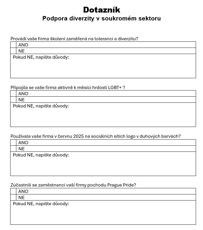 Cílem tohoto dotazníku není někoho šikanovat či postihovat, ale naopak zjistit, jaký servis od nás budou firmy potřebovat, aby mohly poskytnout každému dosud diskriminovanému zaměstnanci harmonické prostředí, kde najde podporu pro svou jinakost.