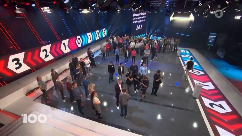 A především názory mladých studentů ukázaly, jak hluboce je německá společnost v otázce války, patriotismu a vztahu k Rusku rozdělena [1]. Pořad „Die 100“ je experimentem v žurnalistice a v tzv. občanské debatě. Do studia přichází sto obyčejných lidí z různých částí Německa, různých věkových skupin a sociálních vrstev. Je to takový trochu větší model toho, co v Česku znáte pod pojmem “Kotel” Míši Jílkové.
