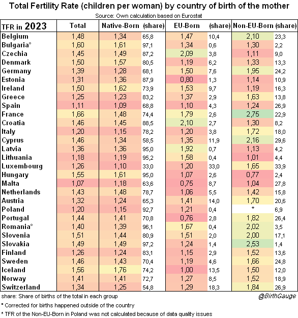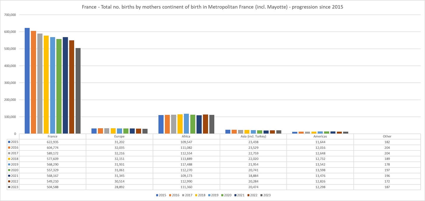 Velmi důležitou statistiku představuje úhrná míra plodnosti (total fertility rate), jelikož ta určuje budoucí dynamiku populace zejména v zemích, kam již mnoho dobyvatelů přišlo. Ve statistice z roku 2023 podle země narození matky Země/EU/ne-EU má Francie nejvyšší plodnost matek narozených mimo EU ze všech zemí EU. Matky narozené ve Francii 1,48, v EU 1,79 a mimo EU 2,75. Je takřka jisté, že kdybychom z matek narozených mimo EU odečetly Ukrajinky, Moldavanky a Rusky, tak plodnost matek mimo EU je ještě vyšší. Mnoho matek narozených ve Francii jsou samy muslimky či Černošky, takže plodnost původních obyvatel Francie je ještě nižší.