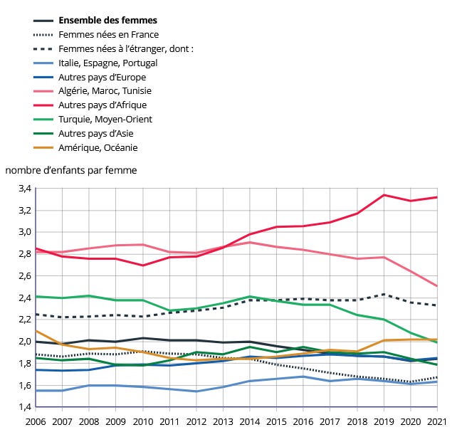 - Ženy narozené ve Francii a dalších románských zemích mají plodnost 1,36, zatímco ženy narozené ve třech maghrebských zemích 2,6 a ve zbytku Afriky 3,4. (2023).