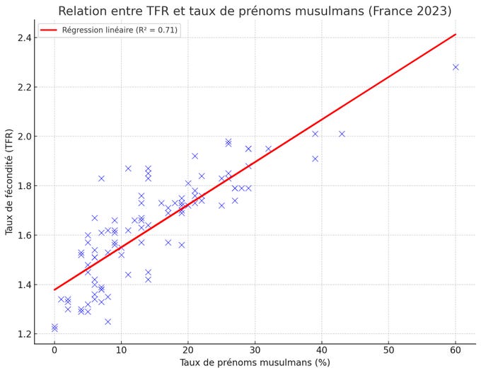 - Nejvíce islamizovaný Saint-Denis má nejvyšší plodnost 2,3. Obecně čím nižší podíl muslimských novorozenců v départementu , tím nižší plodnost. Tři départementy, které mají plodnost nad 2.0, mají podíl musliských novorozenců nad 38%.