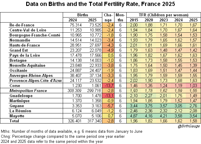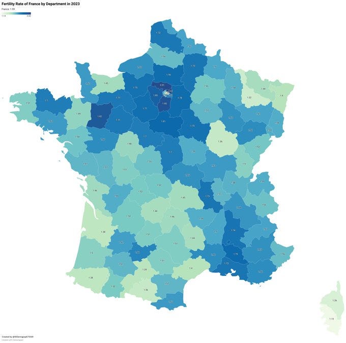 V roce 2025 měl nejvyšší plodnost 1,94 département Val-d’Oise, který je druhý nejvíce islamizovaný (44,8% nar.) a druhou nejvyšší (1,92) Saint-Denis, který je nejvíce islamizovaný (60,3%):