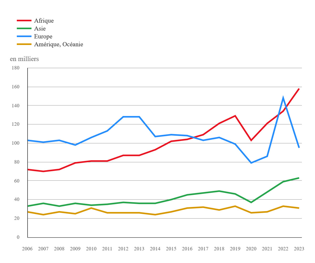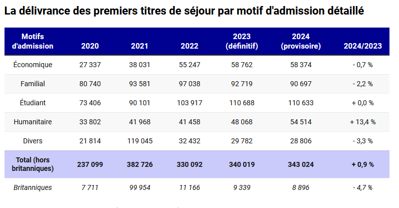 - V roce 2023 přišlo do Francie 158 000 migrantů z Afriky a 63 000 migrantů z Asie. V letech 2015 až 2023 1 081 000 Afričanů a 434 000 Asiatů.