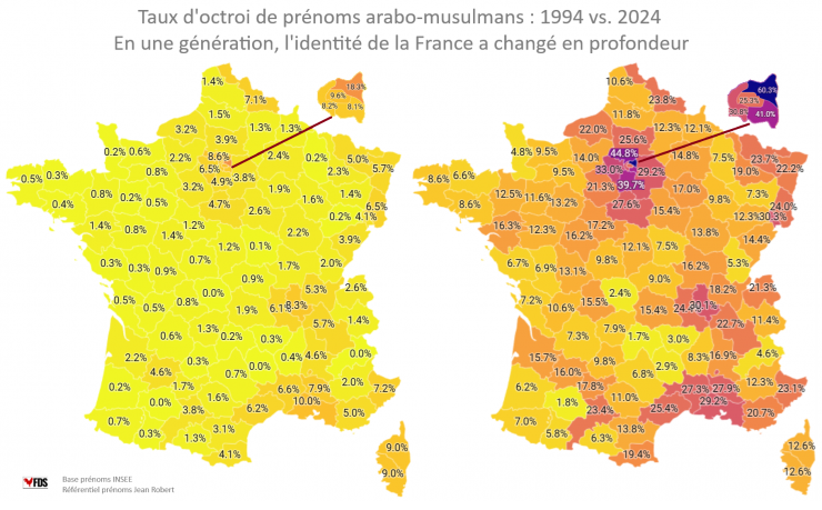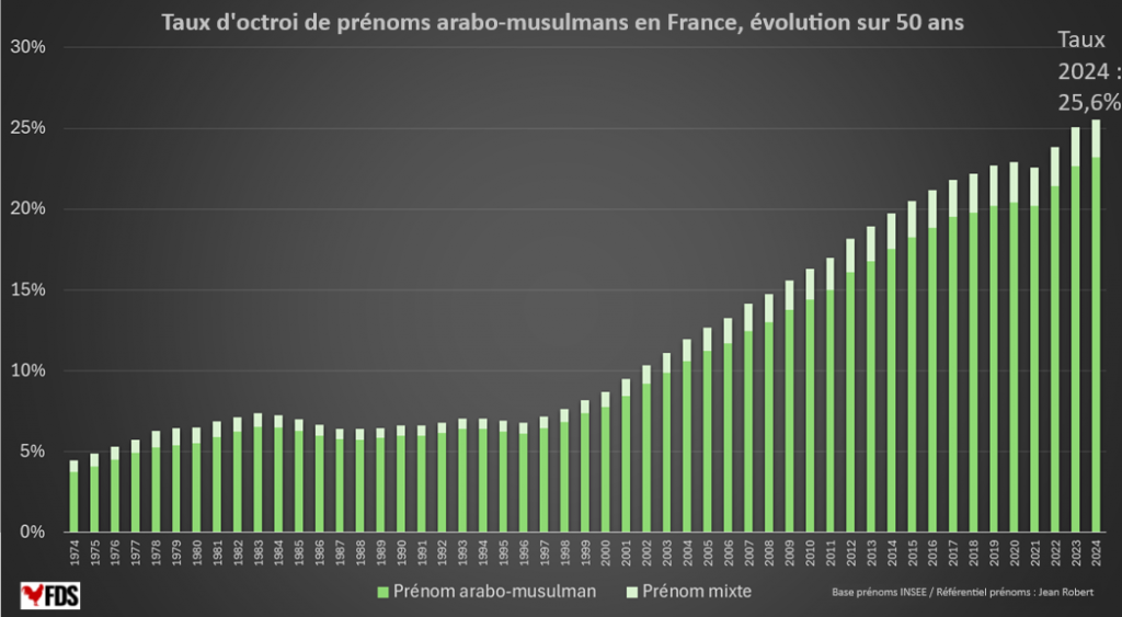 Klíčový zdroj dat o islamizace Francie představuje analýza jmen, ač pochopitelně nemůže být zcela přesná, jelikož ne všichni muslimové udělují svým dětem muslimská jména. U společných jmen, která se vyskytují u křesťanů/židů i muslimů počítali polovinu nositelů těchto jmen (jedná se např. o starozákonní jméno Adam, ale převázně jde o libanonská a syrská jména, která mohou mít levantští křesťané i muslimové. Z celkového podílu muslimských jmen však započtená polovina společných jmen tvoří jen přibližně desetinu). V roce 2024 mělo 25,6% narozených dětí ve Francii (bez zámořských území) islámská jména. Jedná se o nárůst o 0,5% oproti roku 2023. Podíl prudce roste od druhé poloviny 90. let. Podíl muslimských jmen u novorozenců překročil 2% v druhé polovině 60. let, 5% roku 1976, 10% roku 2002, 15% roku 2009, 20% roku 2015 a 25% roku 2024. Politici a další mocní (soudci, Brusel a intelektuální elity) mohli vidět, že se něco děje, ale nic s tím neudělali, jelikož nepřemýšleli do budoucna, zatímco to nechali dojít do současného stavu, kdy s tím již nic dělat nelze, jelikož rozdílem v plodnosti mezi dobyvateli a původním obyvatelstvem budou muslimové tvořit většinu, i kdyby stát už nikoho dalšího nepřijal. K možnosti deportací občanů na základě původu by bylo nutné zcela svrhnout současný systém.