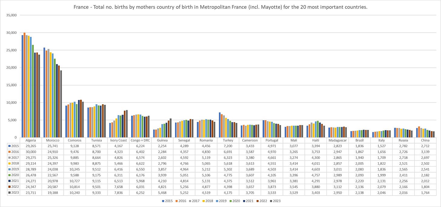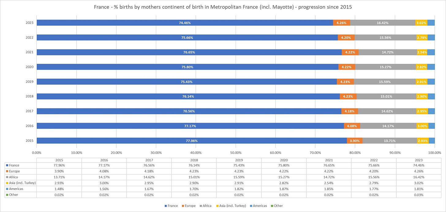Roku 2023 se narodilo 677 803 dětí: 450 077 (66,4%) má oba rodiče narozené ve Francii, 102 033 (15,05%) jednoho rodiče narozeného v cizině a 125 693 (18,54%) oba rodiče narozené v cizině. V případě obou rodičů narozených v cizině se u 8 238 dětí jedná o země EU a u 113 738 o zbytek světa. Tyto údaje však nejsou příliš důležité, jelikož zvláště v případě Francie platí, že i mnoho nejdrsnějších islamistů se zde již narodilo, naopak mnozí přistěhovalci jsou např. Portugalci či Ukrajinci, kteří by se do francouzské společnosti postupně bez problému začlenili (respektive se z islámské společnosti vrátí do své domoviny).