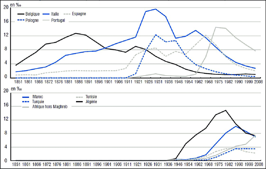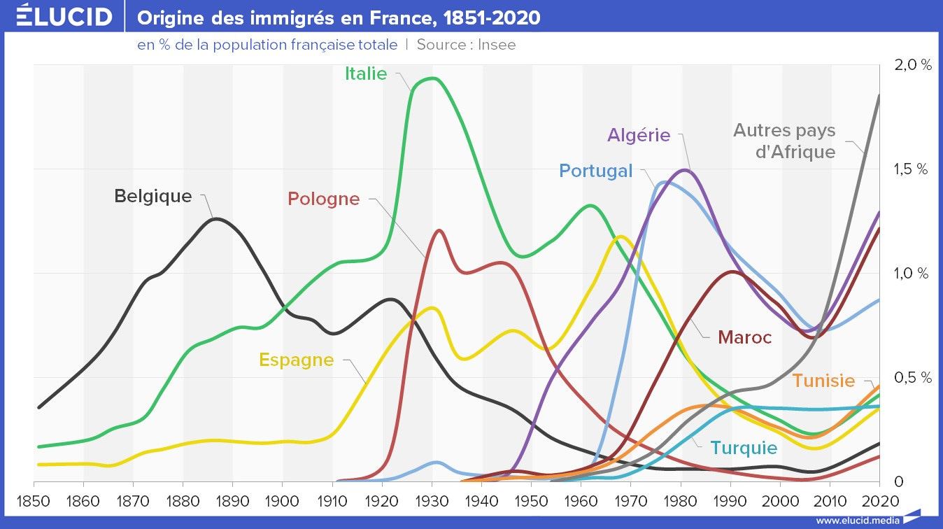Industriazalice Francie a její nízká porodnost oproti jiným evropským zemím umožnila poměrně rozsáhlou pracovní imigraci ze zemí stejného kulturního okruhu, (a mnohdy i vzájemně celkem srozumitelného jazyka) zejména z Itálie, Polska a Belgie. Italové bez francouzského občanství v roce 1930 tvořili vyšší podíl na francouzské populaci než dnes nebo kdykoli dřív Alžířané či Maročané či kdokoli jiný bez francouzského občanství, avšak když sečteme např. Alžířany a Maročany dohromady, tak dnes převyšují podíl Italů v meziválečném období. Právě imigrace jiných Evropanů, kteří se buďto po nějaké době vrátili domů (zejména za velké hospodářské krize) a nebo v další generaci splynuli s francouzskou společností, mohla vyvolat dojem, že masová africká imigrace proběhne stejně, což byl tragický omyl. Imigrace Italů, jakožto velmi podobného národa, nepřinesla žádné závažné problémy, ač samozřejmě situace využívala mafie pro nové trhy, ale nešlo o nic fatálního pro celou společnost. Koneckonců, Ital z Milána měl k Francouzi z Paříže kulturně blíže, než venkovan z Gaskoňska a než zejména venkovan ze vždy pomerně drsnější a klanovější Korsiky. Imigrace podobných národů i ve větší míře je schopna zcela splynout. U nás se v budoucnu může stát, že na základě relativně bezproblémové ukrajinské imigrace si lidé budou myslet, že podobně bezproblémová bude imigrace z Afriky a Blízkého východu.