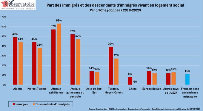 - Zatímco u Francouzů, Evropanů a východních Asiatů se podíl obyvatel sociálního bydlení pohybuje mezi 8% až 15%, tak u různých skupin Afričanů mezi 38% až 63%.