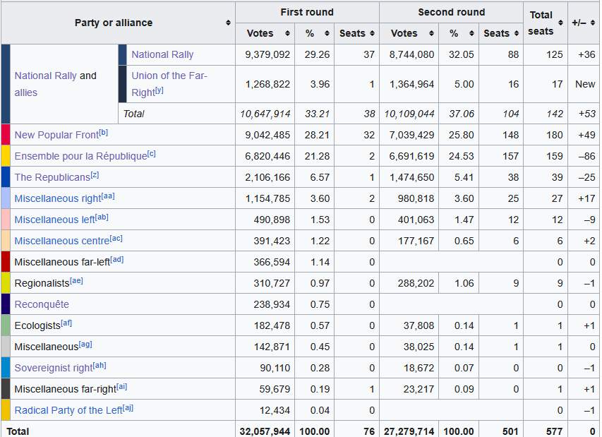 - Republikáni (Les Républicains) – rádoby konzervativně pravicová strana, která však odmítá spolupráci s Národním sdružením. Ve volbách roku 2024 získali v druhém kole 5,47% hlasů.