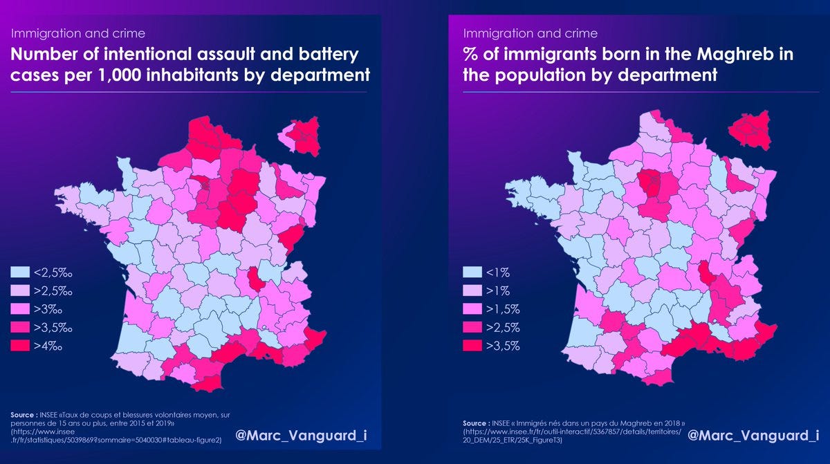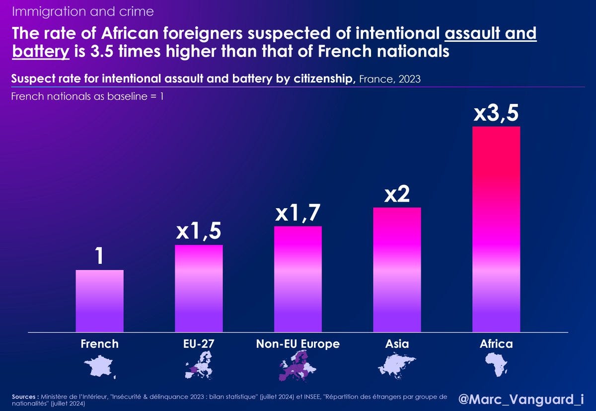 - Oproti jiným zemím pochopitelně Francie nemá data podle původu. Občané afrických zemí mají 3,5* vyšší míru ublížení na zdraví a napadení a 2,2* vyšší míru sexuálních zločinů než občané Francie (vč. mnoha muslimů).