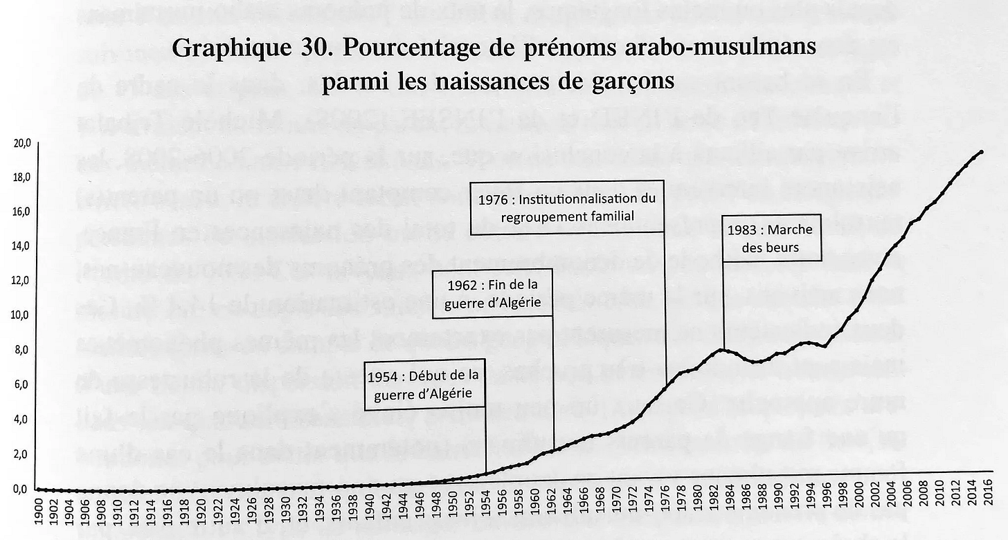 - Podíl islámských jmen mezi novorozenci prudce roste (1976 – 5%, 2002 – 10%, 2009 – 15%, 2015 – 20%. 2023 – 25%). Průměrným nárůstem kolem 5% za 7 let bude mít polovina narozených ve Francii muslimská jména v roce 2058, tedy koncem našeho století se Francie stane většinově islámskou zemí. Občanská válka vedená podle náboženského a rasového klíče je velmi pravděpodobná a bude velmi krvavá.