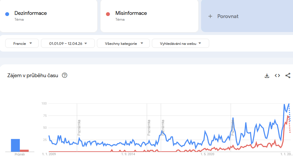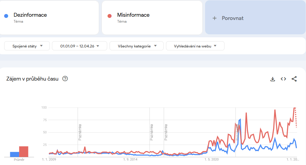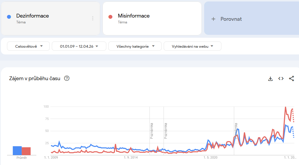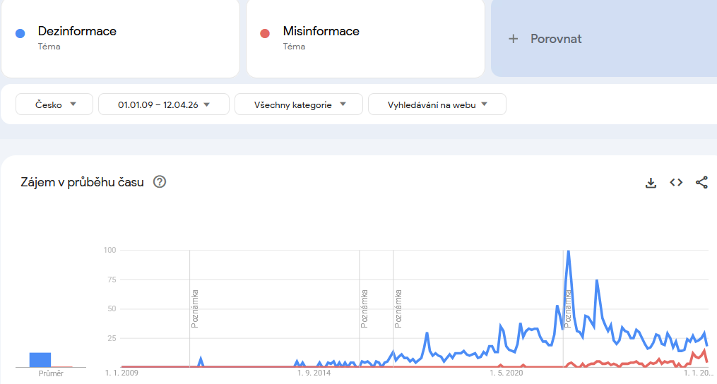 V Česku před podzimem 2016 se tato slova prakticky nevyhledávala, přičemž před rokem 2014 jsou statisticky významná vyhledávání zaznamenána jen jednou. Slovo dezinformace se do českého prostředí začalo dostávat s globálními trendy po amerických volbách v roce 2016, přičemž více se rozmohlo na přelomu let 2017 a 2018 v souvislosti s českými prezidentskými volbami. Právě z doby těchto voleb si slovo dezinformace já osobně poprvé vybavuji. K dalšímu nárůstu došlo za covidu a po ruské invazi na Ukrajinu, ač od té doby frekvence slova dezinformace klesá.