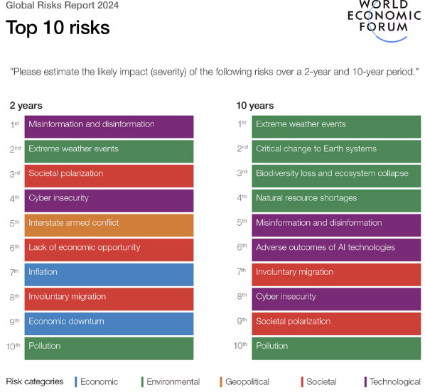 Jako doklad extrémní morální paniky a posedlosti progresivistických elit z dezinformací lze uvést, že Světové ekonomické fórum se v lednu 2024 dotázalo 1 500 expertů na globální zprávu o riziku, přičemž v žebříčku největších globálních rizik pro příští dva roky na první místo jakožto největší globální riziko umístili dezinformace a misinformace a na třetí místo společenskou polarizaci, tedy další záminku progresivistů. Naopak skutečné problémy jsou umístěny níže, např. intenzivní mezistátní konflikt stojí na 5. místě, inflace na 7. místě, globální ekonomická katastrofa na 9. místě a znečištění na 10. místě. Jen velmi málo ověřovačů faktů odhalí zjevné dezinformace, pokud autorem je progresivista. Také je třeba uvést, že zdroj Světové ekonomické fórum je automaticky brán v médiích a vědeckých studiích či na Wikipedii jako věrohodný zdroj a jeho tvrzení jako objektivní pravda, tudíž taková tabulka může mít dalekosáhlý dopad. Není překvapením, že dané tvrzení sdílela Evropská unie.