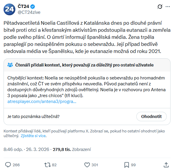 - Zamlčený kontext České televize: Oficiální profil České televize na Twitteru vydal 26. března 2026 tweet o silně kritizované eutanázii pětadvacetileté Noelie Castillové, kterou v dětství stát odebral, a následně se stala se obětí skupinového znásilnění. ČT ve svém tweetu zcela zamlčela její odebrání a skupinové znásilnění, což není sice přímo dezinformace, ale hrubě chybějící kontext. Sice nelze dohledat, zda pachateli skupinového znásilnění byli migranti, nejspíše muslimové, avšak vzhledem k tomu, že mezi pachateli skupinových znásilnění v západní Evropě tvoří většinu pachatelů, to lze považovat za velmi pravděpodobné.