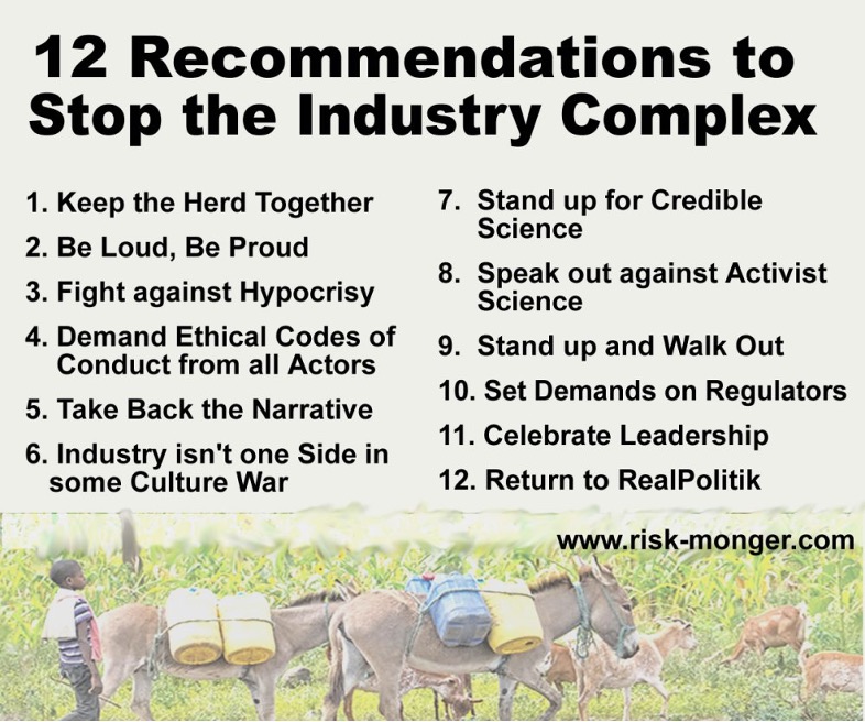 - o tom, že existují aktivistické skupiny, vědci a právníci, kteří vedou mnohostranné kampaně s jediným cílem zruinovat průmysl a zničit jeho pověst v očích veřejnosti;