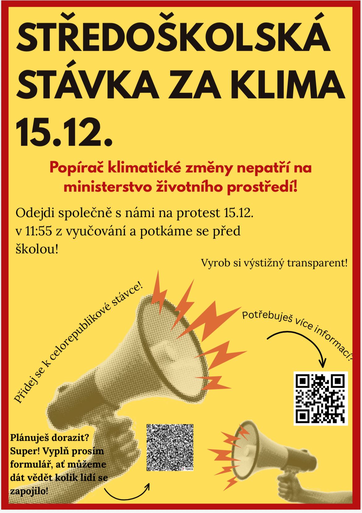 Přátelé, jistě jste zaznamenali, že je v pondělí 15. 12. 2025 kolem poledne plánovaná středoškolská stávka za klima. Jejím hlavním organizátorem je klimatické studentské hnutí Fridays for Future – je to studentská iniciativa, která vzešla z protestů Grety Thunbergové. Tato iniciativa mobilizuje studenty k protestům proti nečinnosti politiků ve věci klimatu. Zároveň ji podpoří demonstrace, která se koná ten den na Hradčanském náměstí v Praze.
