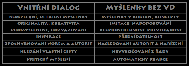 Nejdřív si pořádně vysvětlíme, co ten vnitřní dialog (VD) vlastně je a co neni, aby nedošlo k nějakejm nejasnostem. Občas si totiž někdo, kdo se k tématu dostane, myslí, že je to jen nedorozumění a lidi si to navzájem špatně vysvětlili a vlastně to máme všichni v hlavě stejně. Nemáme!