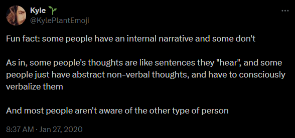 Člověk by si snadno moh myslet, že vnitřní dialog je něco, co nás odlišuje od zvířat nebo robotů – že je to definující charakteristika „lidství“, ale neni člověk jako člověk a realita je taková, že zřejmě docela velký množství lidí tu vnitřní řeč nemá a přitom navenek fungujou normálně a nikdo si ničeho nevšim, což je taky důvod, proč většina lidí vůbec netuší, že někdo jinej může myslet úplně jinak, než oni.