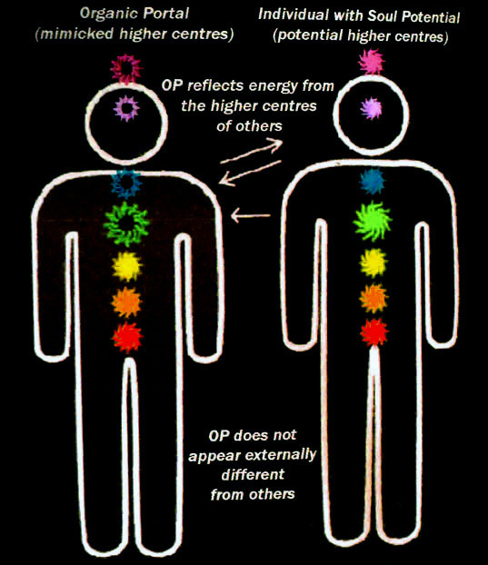 OP má aktivní jen spodní tři čakry. Ve stejný situaci je i spousta lidí s duší, protože si prostě ve svejch inkarnacích ještě neprošli dostatečným množstvím zkušeností, aby dokázali aktivovat vyšší centra, ale rozdíl je, že tu schopnost maji, zatímco OP, aspoň za současnýho stavu, tu možnost nemaji. (Podle intergalaktickejch zdrojů by museli bejt začleněni do fungující, harmonický společnosti s orientací STO, aby se u nich mohlo vyvinout něco „vyššího“. Museli by mít odpovídající „vedení“ nebo asistenci.)